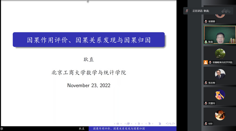 2022年11月23日晚19:00,北京工商大学耿直教授应邀为公司师生做题为“因果作用评价,因果关系发现与因果归因”的报告。本期讲座由太阳成集团tyc7111cc经理张耀峰教授主持并致欢迎辞,校内师生及国内同行老师150余人线上参与本次讲座。