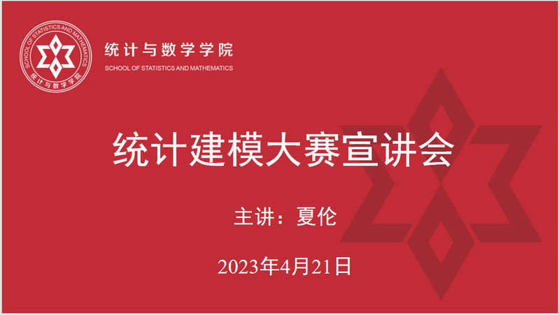 宣讲会由统计系主任夏伦主讲。夏老师首先介绍了统计建模大赛的赛事规格、赛事目标、主办单位、奖项设置等基本情况;接着,重点解读了比赛主题、选题策略和作品提交流程与规范,指出统计建模大赛的学术性与专业性较高;最后,夏老师分享了两篇历年大赛获奖作品,提供了学习资源的获取途径,并预祝大家在取得满意成绩的同时,提高运用统计模型解决实际问题的能力。