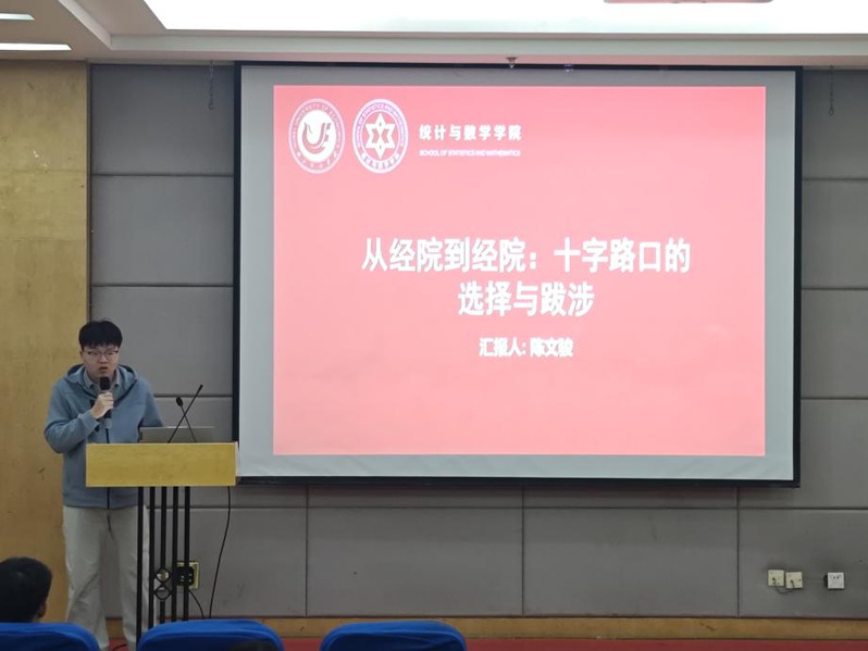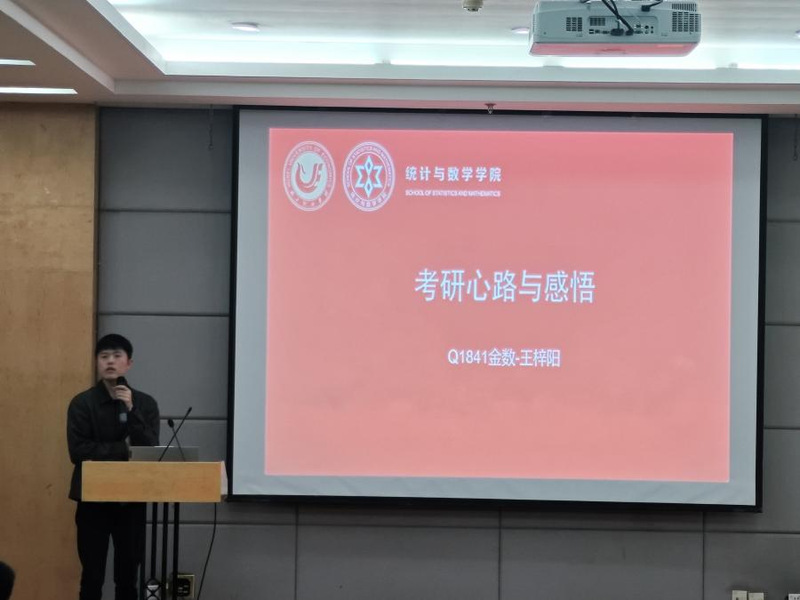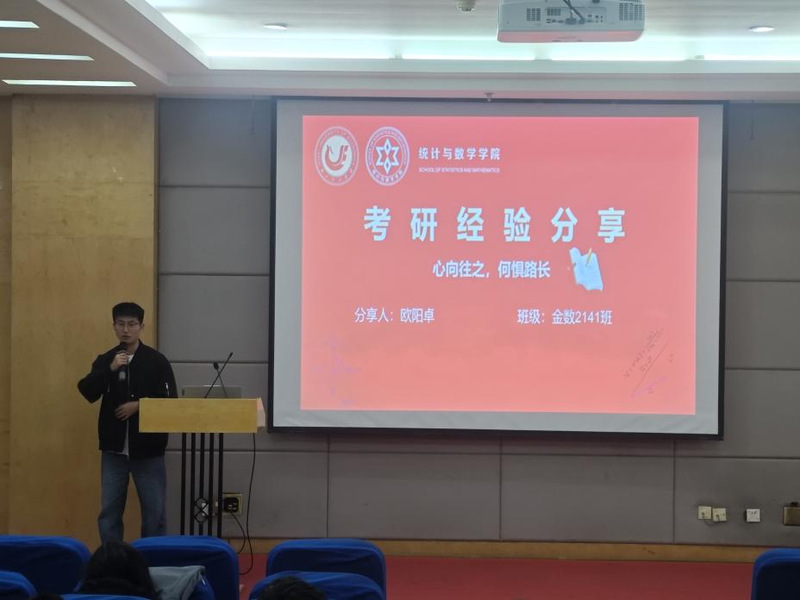 活动开始前3位学长都一一表达了对班主任沈老师当初对他们的严格要求和人生方向引导的感激之情,也感谢湖经统数学院对他们的培养。首先来自金融数学2018级王梓阳学长就读于武汉大学公共管理专业硕士,他跟大家分享了自己边工作边考研的心路历程,叮嘱学弟学妹们在学校期间应该学好哪些专业与基础课程,锻炼哪些能力才能应对将来的工作形势和就业压力,工作中要学会抗压和减压,积极向阳,希望学弟学妹们一路向阳奔赴自己的梦想前程。接着于跃学长目前就读于重庆医科大学的硕士研究生二年级,他就找工作心得体会与应对如今就业形势,在校期间应该多参加各类学科竞赛是使得自己的编程能力得到提升与进步的有效方式,叮嘱学弟学妹们牟定方向加油努力,只管耕耘,结果就在前方等着大家。陈文骏学长以幽默诙谐的方式与大家分享了自己第一次考北京师范大学珠海学院复试差几分经历以及后续考研调剂的心路历程,到最后二战还是回到了湖经的经历,告诉大家每一站路都有不同的风景和人生收获与成长,要学会往前看,有时选择比努力更重要。最后,来自金数2021级欧阳卓学长,目前就读于深圳大学应用统计专业硕士,他为考研的学弟学妹们带来了备考研究生学习和心里调节等带了满满的干活,他结合自己的备考经历,从择校策略、时间管理、资料选择、心态调整等多个维度进行了深入浅出的分享与交流。