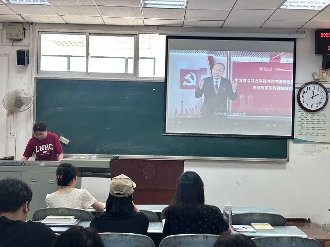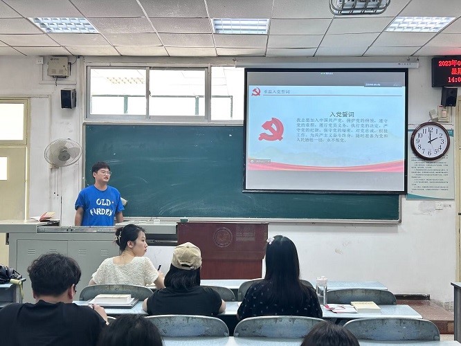 活动第二项,主题党日分享。发展对象付子晗同学从三个方面来带领大家深刻认识开展主题教育的重大意义,分别为:此项举措是党中央统缆全局作出的重大部署、是建设保持先进性和纯洁性百年大党的重要举措、是推进新时代中国特色社会主义的迫切需要;预备党员冯亚蕾同志从三个方面带领大家理解准确把握主题教育的实施要点,分别是:要强化理论学习、要推动高质量发展、要抓好检视整改。