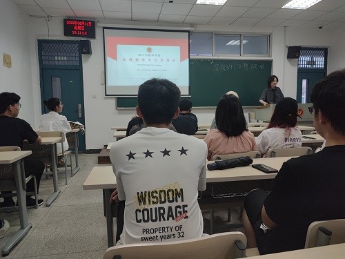 吴杰、吴天浩、李材进在金数2041班进行考研心得分享。由吴杰结合自身经历从信息搜集、目标选择、复习规划、学习时长以及调剂五个方面进行考研经验的分享。金数1941班吴天浩分享了他的个人经历。他说道,考研是一场持久战,整个过程中心态很重要,同学们应该放平心态,不必过于焦虑,把握好自己的复习节奏,每天坚持踏踏实实地学习,相信自己。同时,他讲述了自己面试的经历,他表示,在面试时应从容应对,要敢于表现自我、展示自我,不要怯场。李材进分享了她的考研备考经验。她从考研科目出发,分别介绍了考研公共课和专业课的备考规划、资料选择以及心态的调整等。她说道,备考过程中的情绪波动是不可避免的,只要目标足够清晰,一直坚持下去,努力度过那些艰难的时光,得到的一定是鲜花锦簇的万里鹏程。