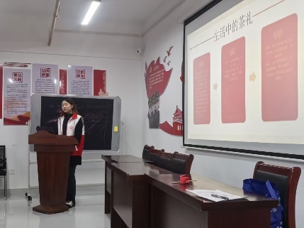 活动现场,孩子们跟着志愿者诵读《诗经》名句、拿着节气饮食卡片分享家乡习俗,用茶具学习“温杯烫盏”的基础茶礼。志愿者站在讲台上借助课件将传统礼仪融入日常场景,孩子们在轻松氛围中感受经典韵味。