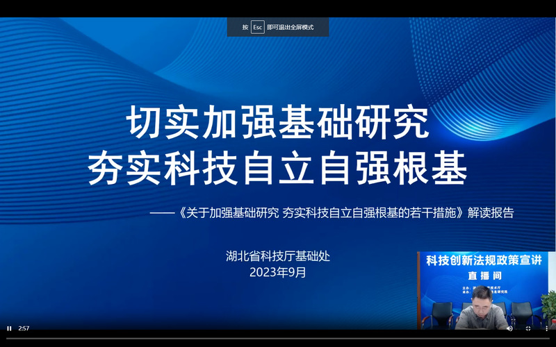 本网讯(通讯员:冯燕美,审稿人:张志刚)9月13日上午,公司组织教师在线观看学习湖北省科学技术厅创新政策法规直播宣讲第二期。 本期宣讲活动首先解读了《关于加强基础研究夯实科技自立自强根基得若干措施》的报告,其次介绍了财政经费使用相关政策、高校院所科技创新相关税收政策、湖北省乡村振兴科技创新示范基地建设相关政策。 此次措施及政策内容指明了研究方向和战略重点,整合优化科技资源配置,改善科技创新生态环境,鼓舞了高校科研工作者。