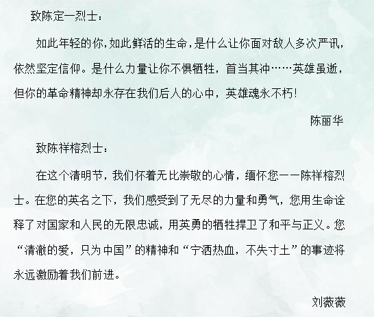 此外,未参加清明扫墓活动的党员、发展对象及积极分子参加了“你长眠,我常念"——清明给英烈写句话的活动。